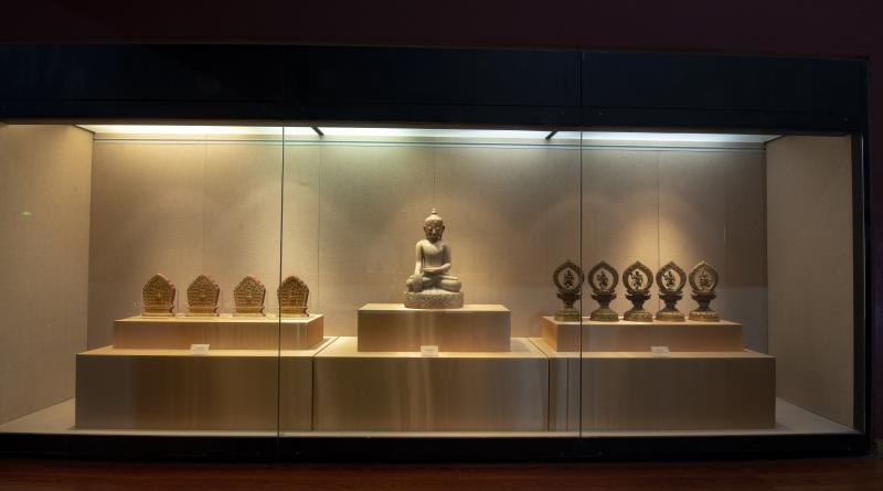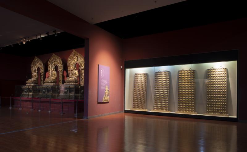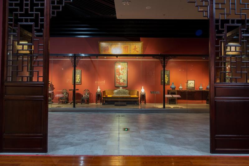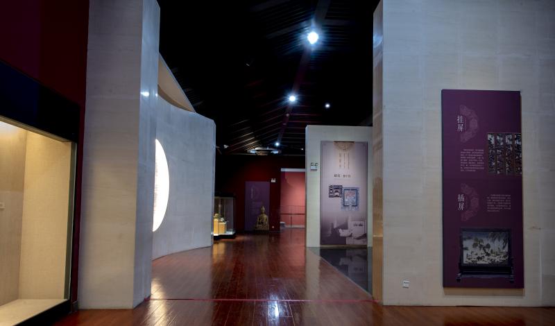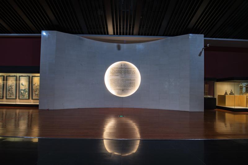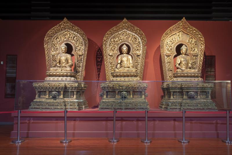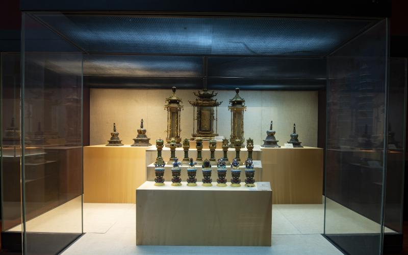系1973年经周恩来理批示、由北京故宫博物院调拨给洛阳博物馆。这批文物原藏故宫慈宁宫大佛堂,多为清代全国各地进贡之品。从种类上看,可分两大类:以宫廷佛教器物为大宗,有各类质地的佛造像及佛龛、法器、供器和礼佛用具等。以宫廷生活用具为辅,有宫廷生活家具、装饰用的插屏、挂屏、字画、瓷器等;从质地上看,有金、银、铜、玉、螺钿、琉璃、象牙、陶瓷、漆木等;从工艺技法上看,有佛教人物、道教人物、山水、花鸟、神话传说等。展览分为三世佛和众佛、一代藏传佛教宗师--宗喀巴、禅祖达摩和众佛、宫廷家具及家居装饰四个部分,展出文物造型多样、用料讲究、工艺精湛,具有非常高的艺术价值,为宫廷佛教和生活用具中的精品。
