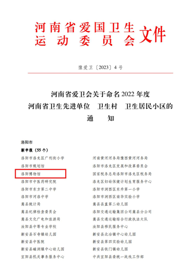 洛阳博物馆讯(供稿:张宏怡 审核:任静华)近日,河南省爱国卫生运动委员会公布了《河南省爱卫会关于命名2022年度河南省卫生先进单位 卫生村 卫生居民小区的通知》...