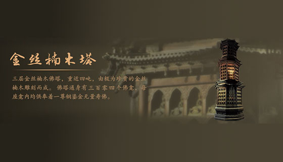 三层金丝楠木佛塔,重近四吨,由极为珍贵的金丝楠木雕刻而成。佛塔通身有两百四十四个佛龛,每座龛内均供奉着一尊铜染金无量寿佛。