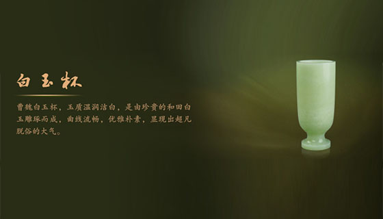 曹魏白玉杯,玉质温润洁白,是由珍贵的和田白玉雕琢而成,曲线流畅,优雅朴素,显现出超凡脱俗的大气。
