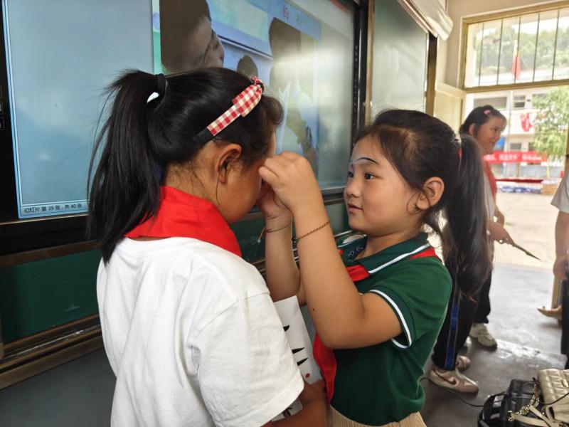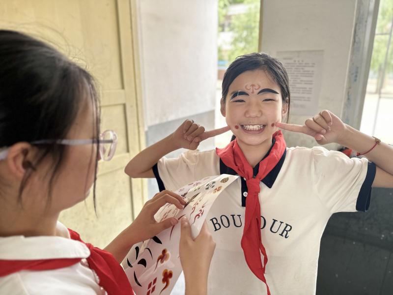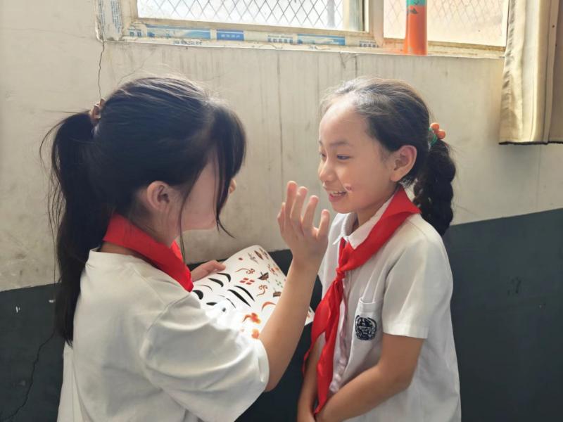 除此之外,研学导师还给学生们带来了一些精美的唐代妆容贴纸。在课堂游戏环节中,学生们热情高涨,积极参与互动,两两为一组,结合之前所学的唐妆知识,用贴纸给自己和搭档都打造了一个美美的唐代妆容。