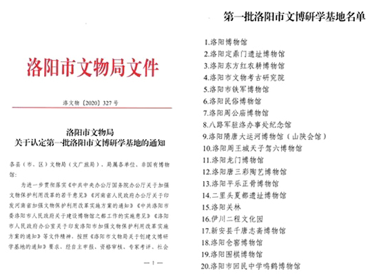 洛阳博物馆讯(供稿:李晨飞)近日,洛阳市文物局印发了《关于认定第一批洛阳市文博研学基地的通知》,认定洛阳博物馆等20家单位为第一批洛阳市文博研学基地。