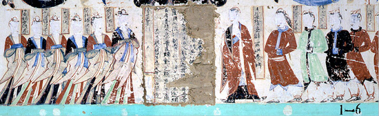 武周圣历元年(698)《李君修莫高窟佛龛碑》记载:“莫高窟者,厥初秦建元二年,有沙门乐僔,戒行清虚,执心恬静。尝杖锡林野,行止此山,忽见神光,状有千佛……遂架空凿岩,造窟一龛。次有法良禅师,从东届此,又于僔师窟侧,更即营建。伽蓝之起,滥觞于二僧,复建平公、东阳王等各修一大窟。”张元林教授,根据碑刻、史料记载,通过285窟壁画供养人形象、供养人题记以及北壁无量寿佛说法图“发愿文”等综合分析,营造285窟者的身份应是“世家大族”、“入华粟特人”、“嚈哒人(滑国人/白匈奴)”。