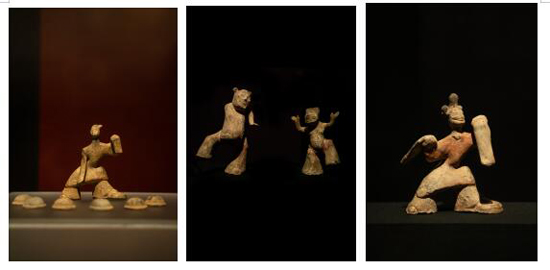 女俑头梳双髻,穿长袖舞衣,着长笼裤,身前倾,双足弓步,作舞蹈状。前置六个小盘鼓,左脚踏一盘鼓,势欲前跃。七盘舞是汉代经典的舞蹈表演节目。七盘舞以盘为主,鼓为陪衬,盘舞中兼踏鼓以为节。舞者于其上用双足踏以节拍。该俑真实再现了七盘舞表演的形象,颇具动态之美。