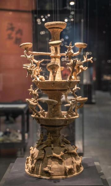 分为上下两个部分,上部分为灯柱和枝杆;灯柱中间分三层,各伸出曲枝以承托灯盏;灯盏下端有一圆盘,盘沿上插有龙形饰,龙尾坐一羽人。灯的下部为象征山峦的喇叭形灯座,座身素有各种动物形象。造型优美,形象生动,反映了东汉时期制陶工艺的发达。