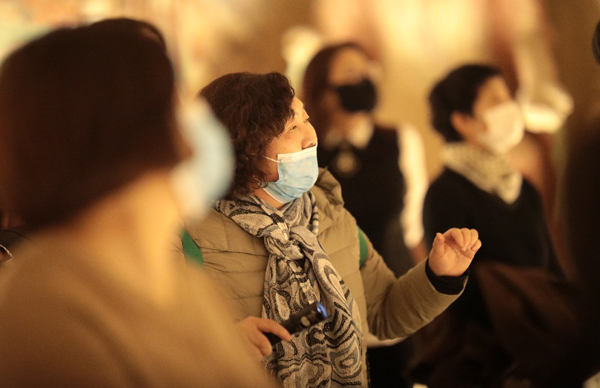 正讨论着,苏东老师走进了办公室,大家立刻说:“苏老师,快给我们讲一下石窟临展!”“大家一起学习交流吧,”苏老师非常谦虚,“我昨天正好又查到了一个新的知识点,咱们一起上去看看。”大家兴奋地交换了一下眼神,无需多言,立刻拿出小电筒,带上笔记本,直奔二楼,趁着中午游客少,抓紧时间学习新的知识。这个洞窟里的壁画,这个飞天和那个飞天手拿的乐器有什么不同?……田文老师、邱华老师、田玉焕老师忙拿出笔记本记下知识要点。时间紧,知识多,先记下,回家再消化,不懂再在微信群里问——因为咱们下午的三次定时讲解可不能受影响!商量好了,下午的定时讲解大家来接力服务。