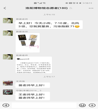 李丽华、刘俐、林青、韩春艳、宋满满等老师坚持练习书法,了解中国文字的发生、发展,在反复练习中感悟、品味优秀传统文化,同时在讲解中融入中国文字发展历程,丰富拓展讲解内容。潘景修、苗菱、刘俐等老师坚持每天给分享洛阳历史、文物常识、摄影技巧等内容,扩充大家的知识储备。