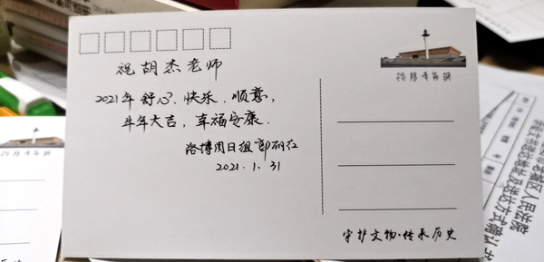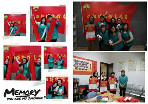 每年春节前,组长郭丽红老师会自费给大家准备小礼品,激励大家。2021年春节前,周日组讲解前十名郭爱民、刘慧敏、马会萍、游丽萍、杨彬、常云慧、马瑞丽、高利平、史绍宇老师就收到了挂历和布偶;为周日组策划的牛年贺卡,由王克强老师书写“洛阳博物馆”篆字,李成龙老师排版打印,郭丽红老师根据每位老师的情况亲笔书写贺卡内容。当权艳丽、涂远明老师收到自己的贺卡时,非常的开心。春节前,胡亚萍老师自备纸墨,为大家送上红红的春联,“一庭春色含生意,几树梅花应早春”,满满的祝福,让大家笑意挂满了脸上,