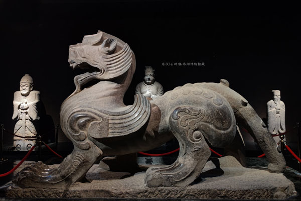 东汉石辟邪,1992年12月出土于洛阳孟津县油坊村,高1.9米,长2.97米,宽0.9米,重量近8吨。通体由整块青石雕凿而成,身若虎豹、头类狮子、昂首斜侧,呈一跃而起的态势。辟邪和天禄,是中国古代神话传说中的祥瑞神兽,可以上天入地,自由的往来于人神之间。在汉代,升仙思想充斥着整个社会,人们在生前没能成仙,便希望死后可以骑上瑞兽,登临仙界。我们面前这件石辟邪,造型伟岸,昂首挺胸,步履矫健,阳刚大气,体现出汉代艺术工匠们丰富的艺术想象力和娴熟的技法,也象征着洛阳作为天子之都,睥睨天下的雄浑霸气,是我馆的镇馆之宝之一。