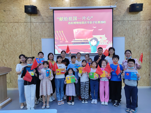2021年10月3日下午14:30,洛阳博物馆博知乐园开展了一场“献给祖国一片心”的线下社教活动。研学导师采用互动知识问答的形式,带领小朋友们了解了国庆节的由来、国歌的由来、国旗的含义、中国国土面积及中国五十六个民族的相关知识,小朋友们回答问题积极,活动现场气氛热烈。问答环节结束后,小朋友们和家长朋友们配合制作精美的手工贺卡,把自己对祖国的美好祝愿汇聚在一张张五彩缤纷的贺卡上,为祖国送去最真挚的祝福。