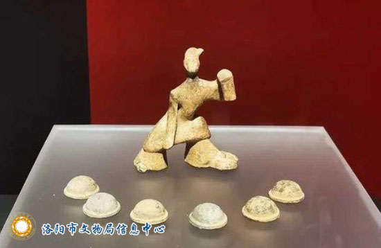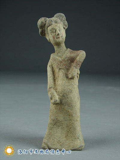 这张图片向大家展示的是洛阳博物馆馆藏文物“北魏女舞俑”。俑高12.6cm,头梳双髻,面部圆润,头部微微向上扬起,身穿交领窄袖长裙,左臂平举屈肘向下,右臂下垂斜贴身侧,髻施黑彩,红腮朱唇,裙施红彩,尽显灵动鲜活之态。