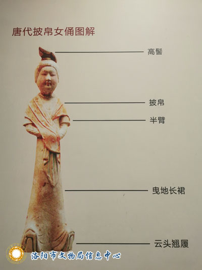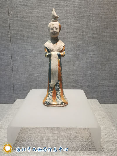 现在大家看到的是洛阳博物馆唐三彩馆所展出的唐代文物“三彩半翻髻女俑”。她头梳半翻髻,肩披白色帔帛,身着黄蓝相间的条纹状长裙,蓝釉上还有白釉做点状装饰,尽显唐代女性典雅俏丽风姿。