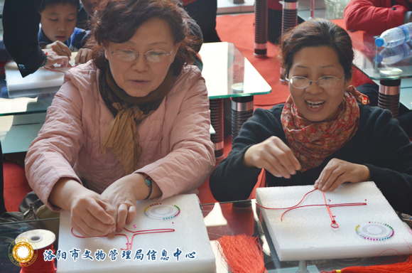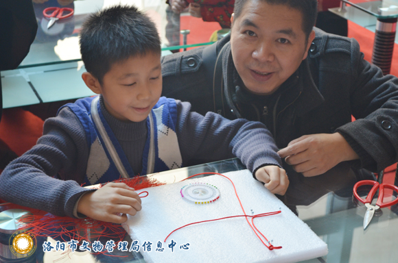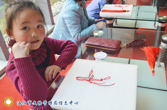 中国结是中国传统的手工艺,早在文字没有诞生之前,人们遇到事情就在绳子上打一个结,称为“结绳记事”。到了商周以及汉代,由于贵族爱玉崇玉,中国结则成为与玉器密不可分的装饰物。在其他朝代,中国结逐渐成为贵族服饰以及室内的装饰物。而它在清代走向民间,在百姓的生活中普及开,也有着福寿绵长的吉祥寓意。而到了现代,中国结成为中国人过年时候不可或缺的吉祥符号,洛阳博物馆把馆藏清代琉璃八宝之一的吉祥结与年俗中的吉祥结巧妙的结合,在2月21日,大年初三,洛阳博物馆的工作人员精心准备了珠针、针板、红绳、流苏、剪刀等工具,举办“巧编吉祥结”的活动,通过学习吉祥结的编法,让大家了解中国结的历史,感受中国传统文化,同时为春节增添一份吉庆有余的美好寓意,为春节假期增添一些趣味。
