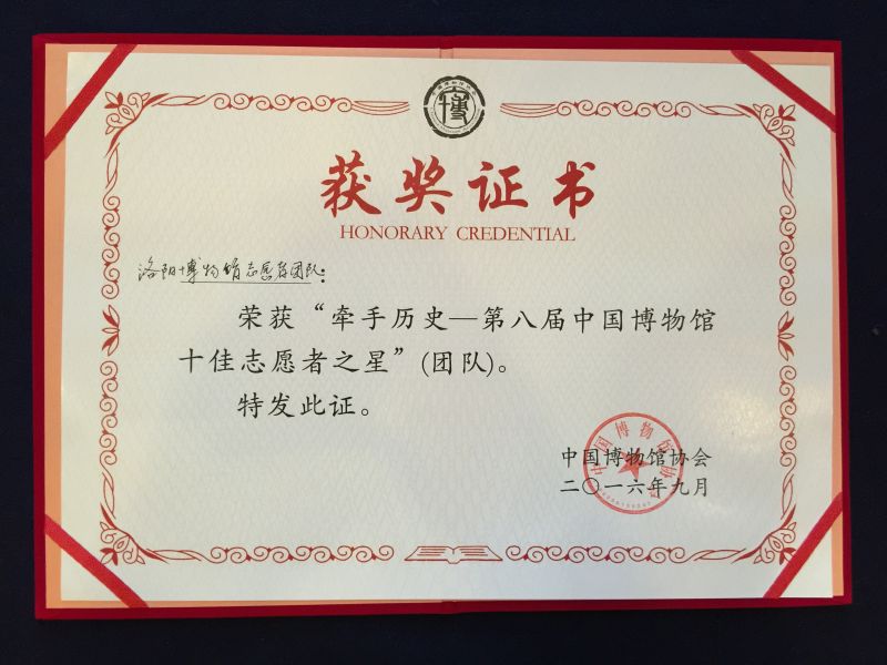 洛阳博物馆志愿者团队成立于2012年,现有志愿者200余名。4年来,洛阳博物馆志愿者团队以自愿、主动、热诚的服务形象,拉近了博物馆与观众之间的距离,服务观众10万余人,服务时间5万余小时,洛阳博物馆志愿者团队也成为洛阳对外宣传的一张亮丽名片。洛阳博物馆志愿团队此次喜获“牵手历史——第八届中国博物馆十佳志愿者之星”优秀团队奖也是继获得第五届、第六届“牵手历史——中国博物馆十佳志愿者之星”优秀团队提名奖和中宣部“四个100”最佳志愿服务项目之后的第四个国家级荣誉。此次荣誉的获得也是对洛阳博物馆志愿者服务团队的肯定和激励,希望能有更多的人感受到志愿服务传递的精神力量,引导更多的人参与到志愿服务的行列中。