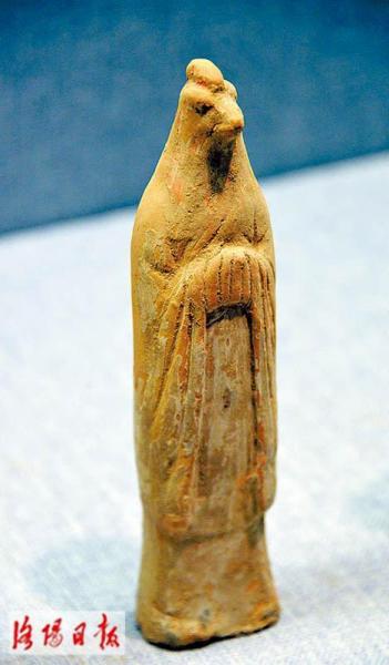 洛阳劳教所工地出土,洛阳博物馆馆藏。鸡俑衣着唐代文官大袖礼服,“握手”而立。