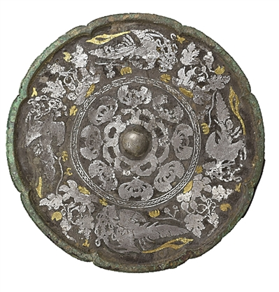 河南洛阳博物馆展陈的唐代金银平脱花鸟纹铜镜。