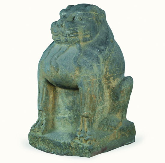 蹲踞状,圆睁双目,须作三缕,弯曲下垂,腹下未镂空,尾巴浮雕在臀部。为北魏孝庄帝静陵石刻。